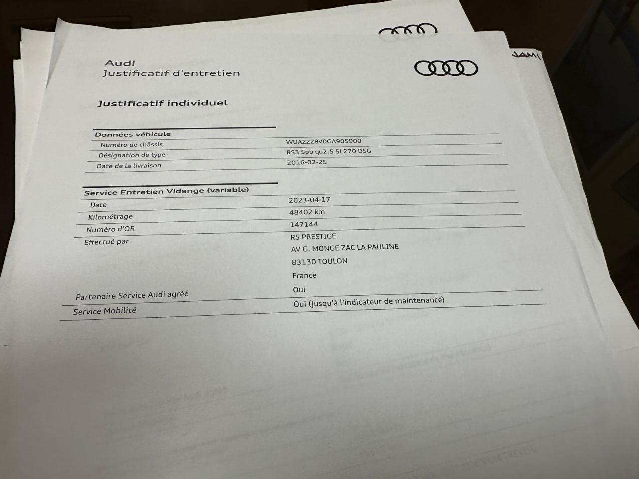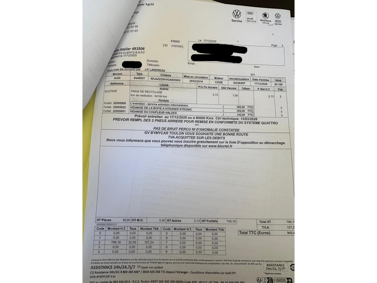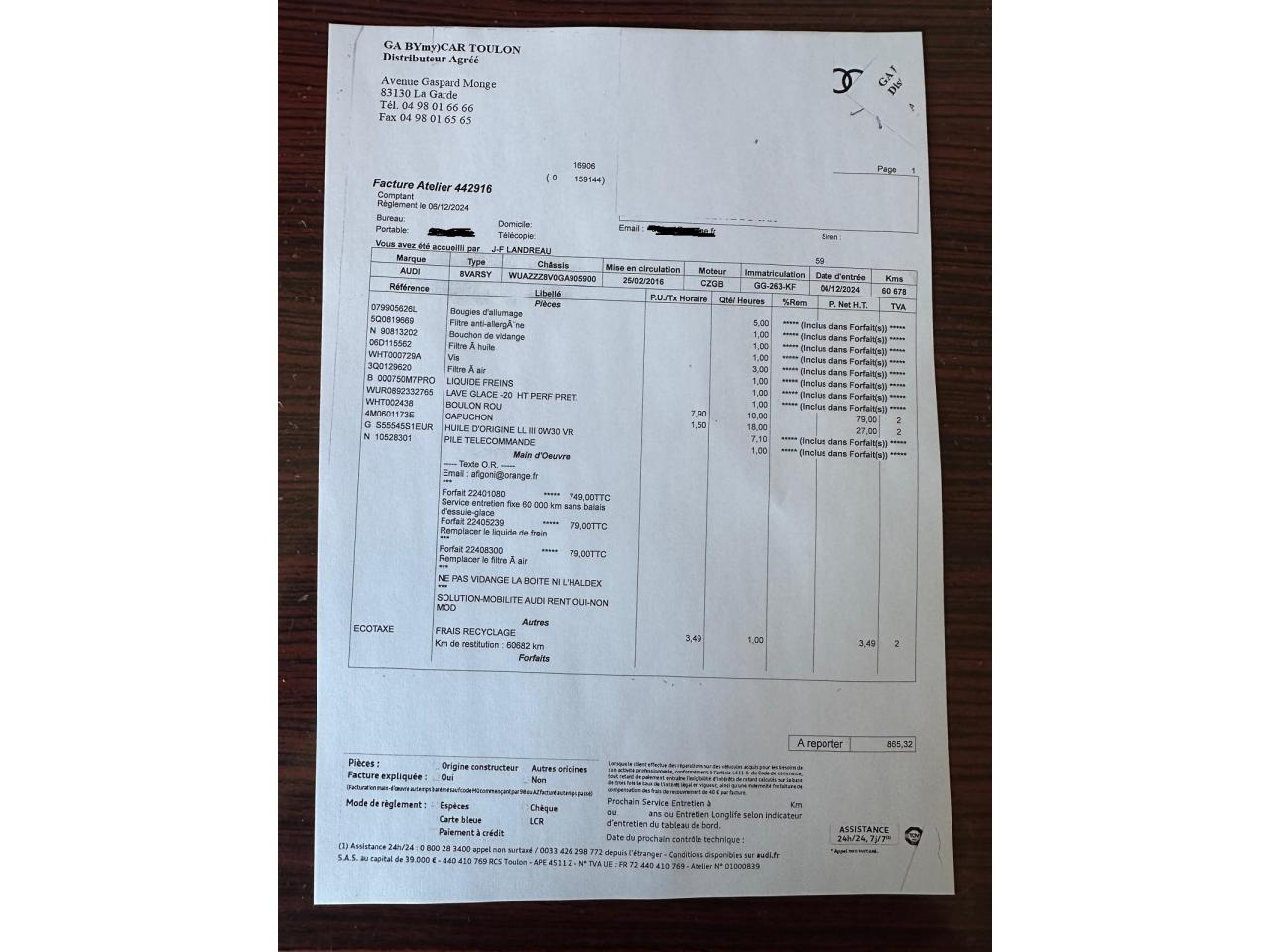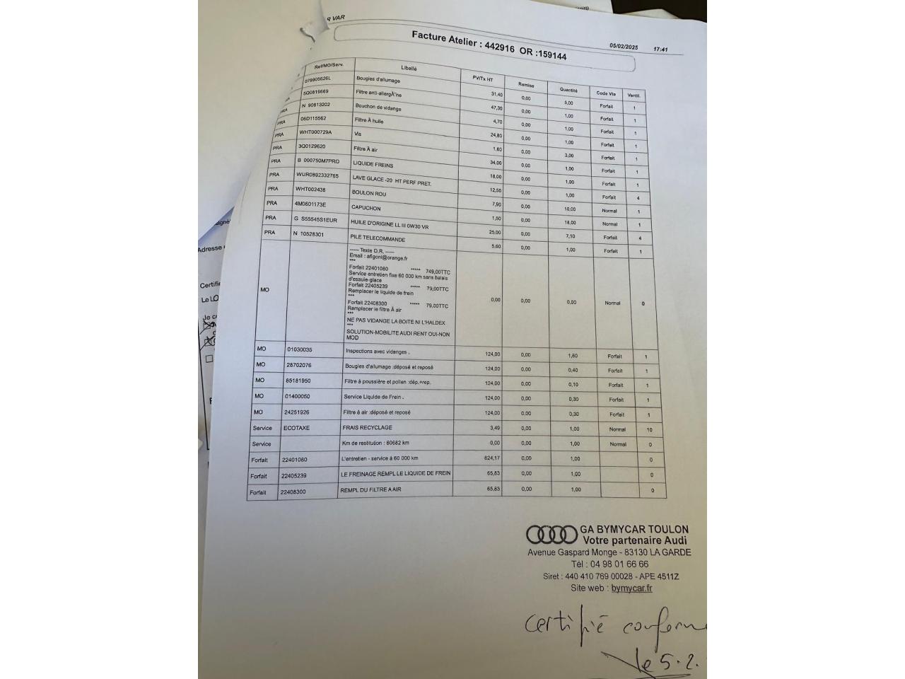 Vidange moteur boite et aldex 17/12/2025 chez AUDI Toulon